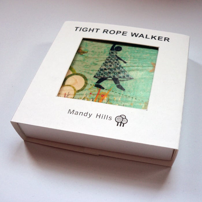 Tight Rope Walker - A beautiful decal print featuring my design of a Tight Rope Walker balancing amongst the trees. My artwork is mounted onto a block of square spruce wood letting the natural variants of the wood appear through my design - making each block unique!