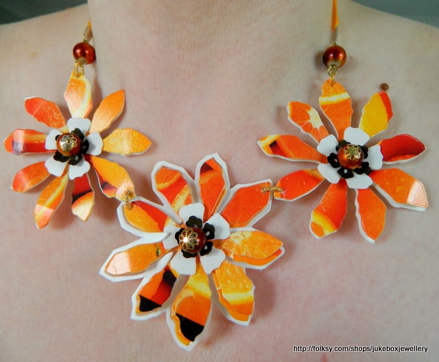 upcycling, saving the planet, eco chic, sustainable living, trashion, orange neclace, eco bride, women gift, tween gift, unique jewellery, one of a kind statement necklace, boho jewellery, hippie chic, shabby chic, ribbon necklace, upcycled plastic packaging, recycled jewellery