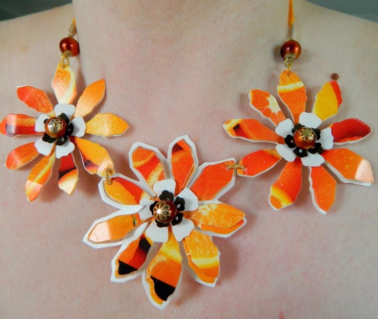 upcycling, saving the planet, eco chic, sustainable living, trashion, orange neclace, eco bride, women gift, tween gift, unique jewellery, one of a kind statement necklace, boho jewellery, hippie chic, shabby chic, ribbon necklace, upcycled plastic packaging, recycled jewellery