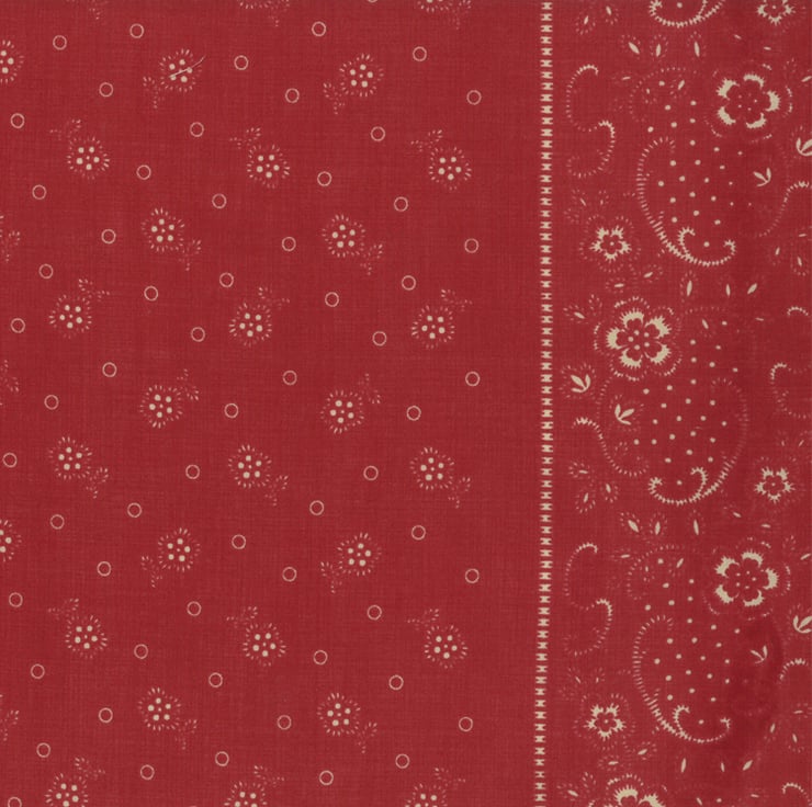 FQ Petite Odile (Red) by French General. Brand new top quality 100% cotton fabric from Moda. Muted red shade with a tiny floral pattern and a border stripe down each side.