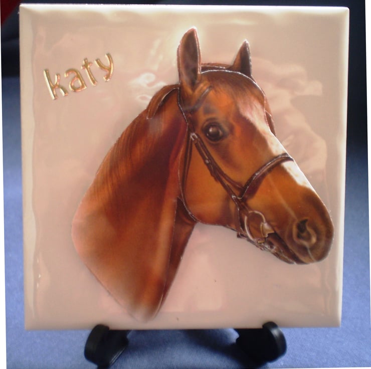 I have made a decoupage/3d picture of a horse and then placed it on a cream tile measuring 10x10cm(4x4 in). I can personalise it with gold letters, please let me know if you would like this. It comes with a small black stand and a white box with gold tie.