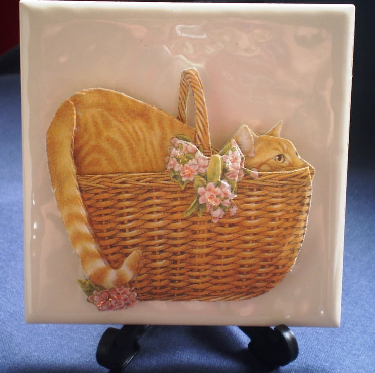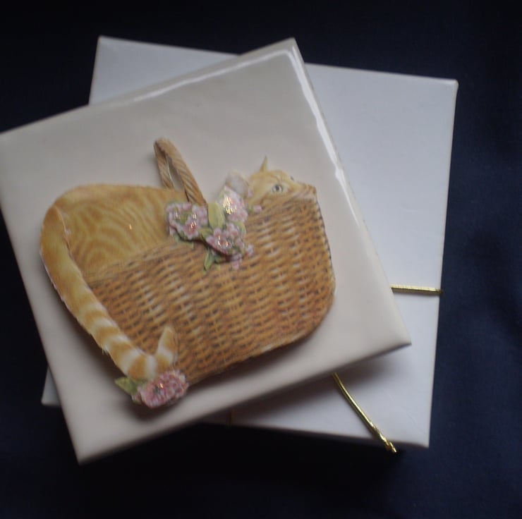 I have put a decoupage/ 3D ginger cat in a basket on a cream tile measuring 10x10 cm (4x4in). I can add a name in gold letters, please let me know if you would like this.