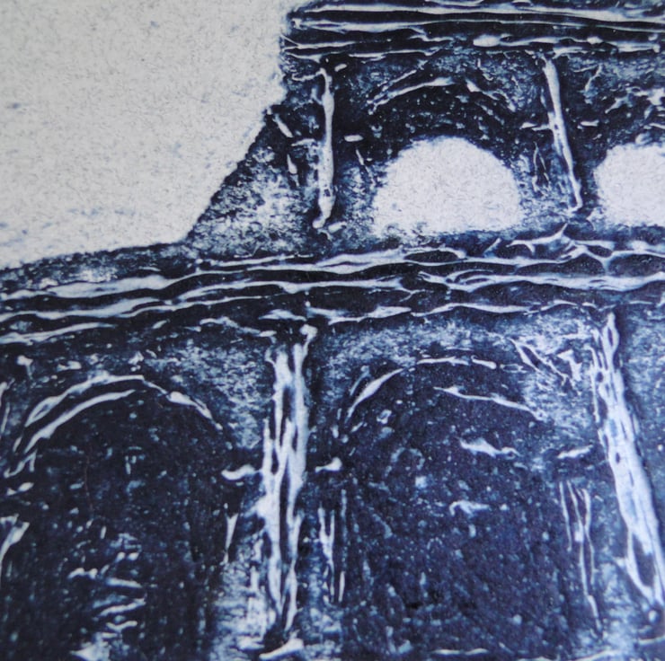 Collagraph Print:Print created from a card plate made by adding paint, glue and other textures. This holds the ink in varying degrees and is printed through the Intaglio process.
