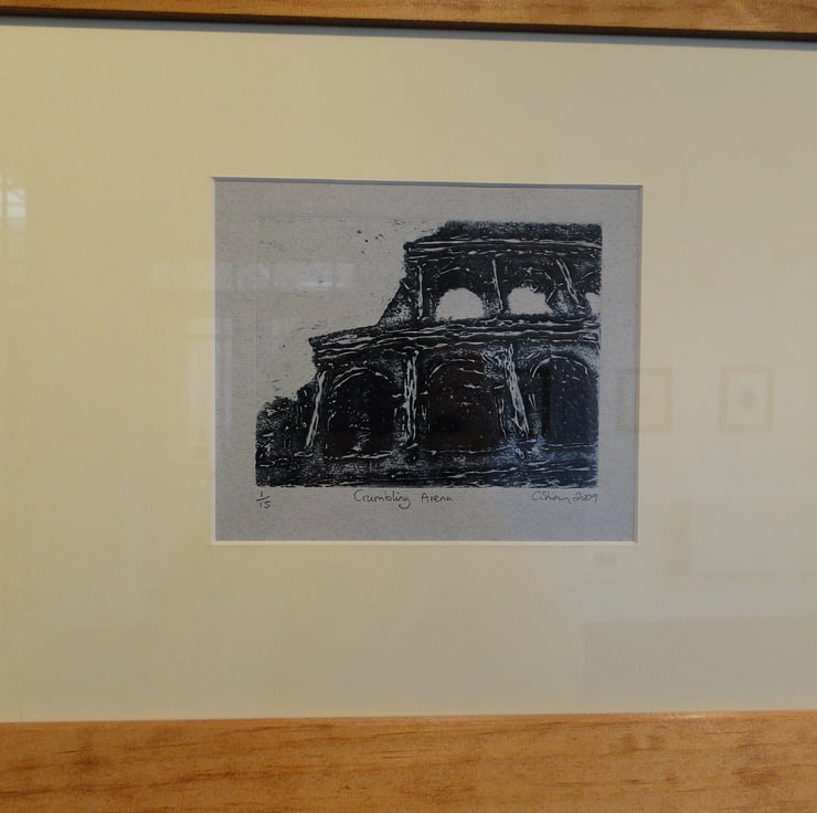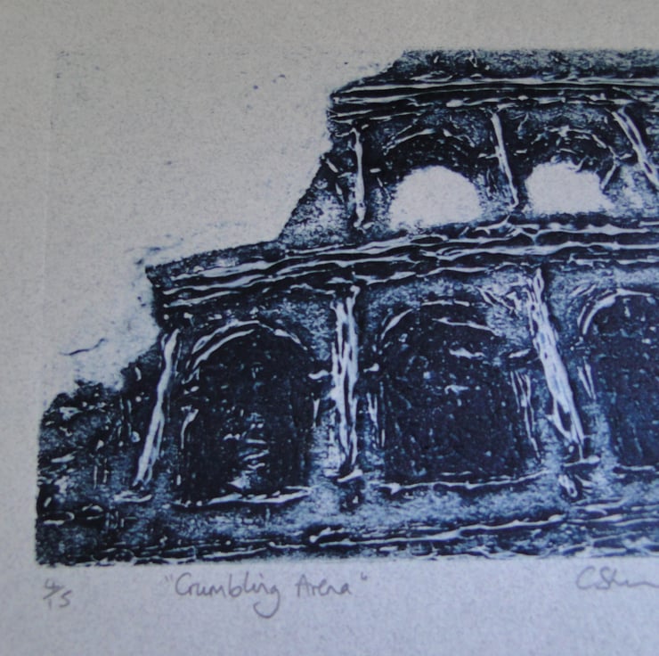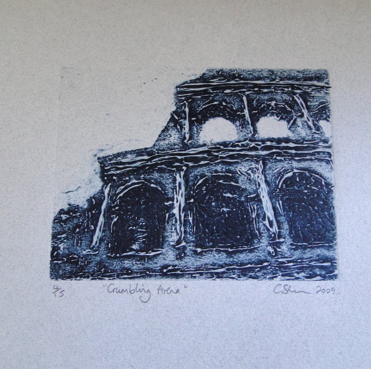 Collagraph print of the Colloseum, Rome. Limited edition of 15 prints. Printed in blue/black on a grey paper. Supplied sealed in cello wrap for protection. (mount and frame not included)