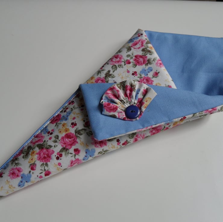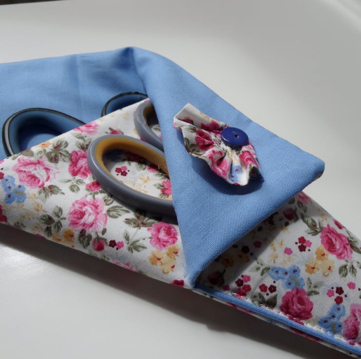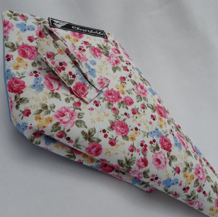 This holder is made from a lovely colourful piece of floral fabric which is cotton. It is lightly padded and lined with contrasting fabric with some decorative detail on the fold. The holder can hold 2 pairs of scissors of different sizes. At the back of it, a fabric hook was sewn to allow the holder to be hooked onto a nearby piece of furniture - particularly useful in sewing when the pair of scissors always cover by the fabric and also can keep the scissors away from the hands of young children. The length of the holder is 12".