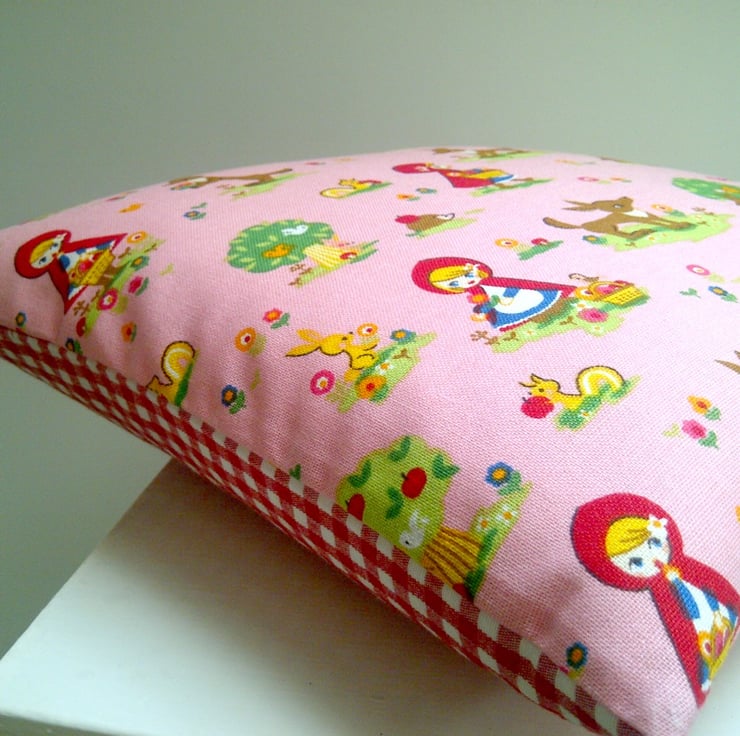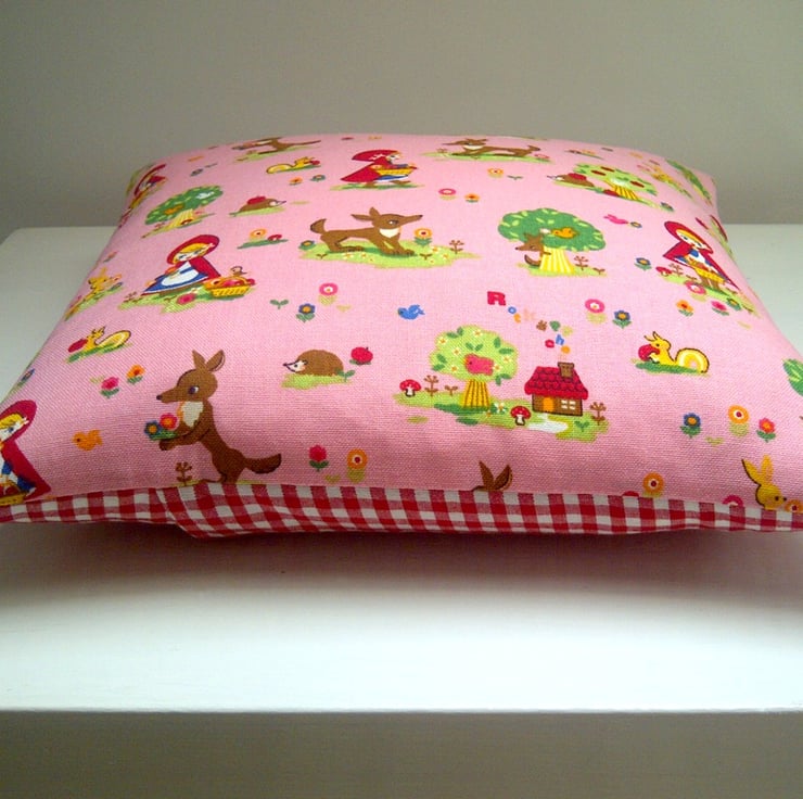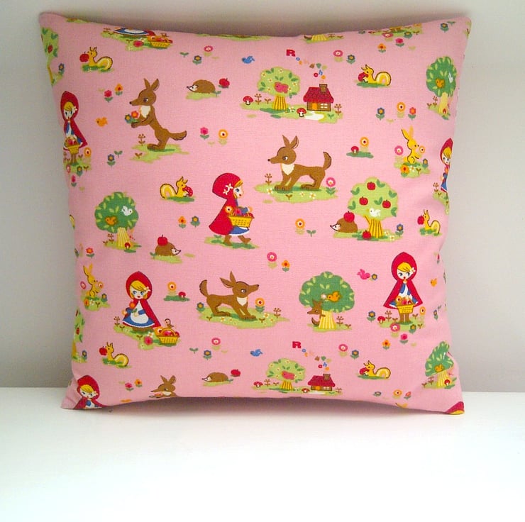 A lovely, simple, small cushion, just perfect for a little girl's bedroom! Featuring images of Red Riding Hood, the Wolf, woodland animals, Grandmother's cottage and little trees. In wonderful bright colours over a salmon pink background.