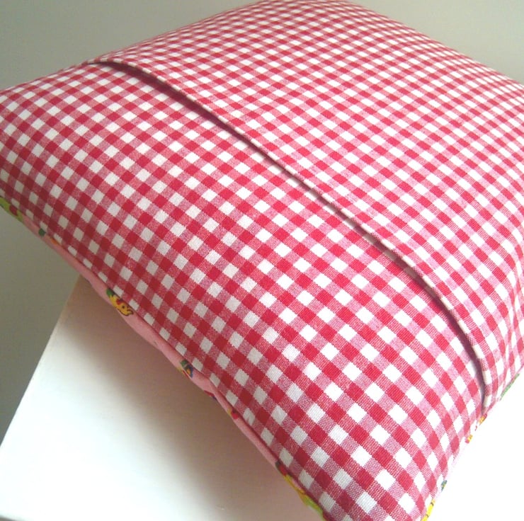 The cushion measures 12" and comes complete with a lovely, squashy, feather inner pad. The reverse of the cushion is made using a red and white gingham cotton woven fabric and has a simple envelope opening.