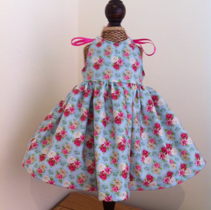 A beautiful sun dress for your Maisy Muffin doll. This dress is really gorgeous. The fabric is so pretty. It buttons at the back with tiny buttons and fastens on the shoulder with ribbons to match the fabric in the dress.
