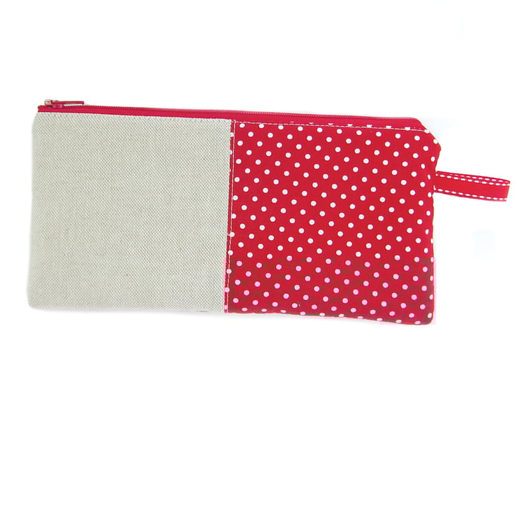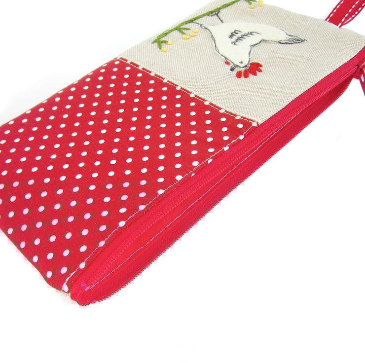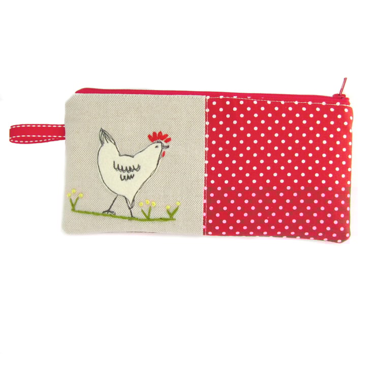 A red dotty pencil case with a hand cut, cream felt hen applique on the front, sewn with free motion embroidery, with hand embroidered flowers. A practical, roomy pencil bag.