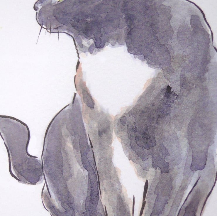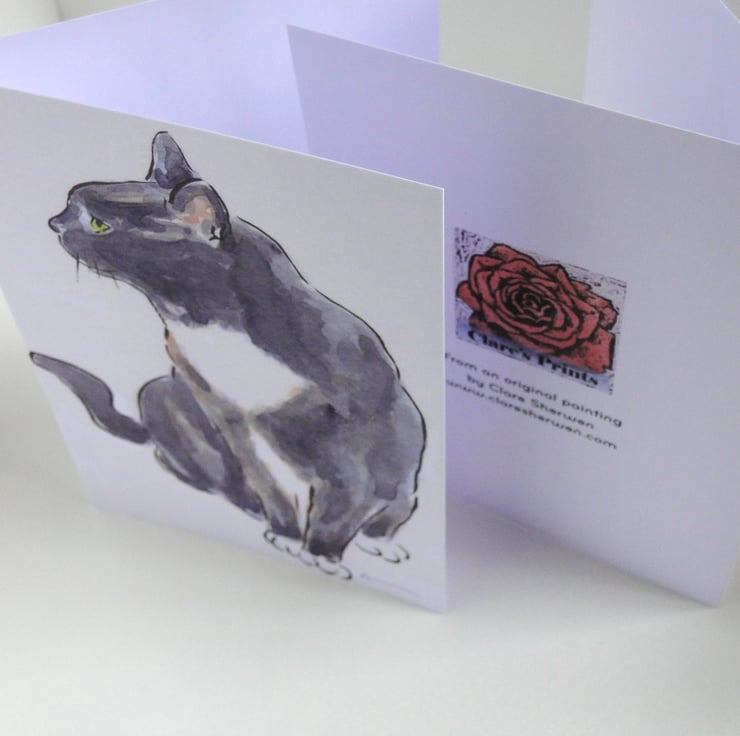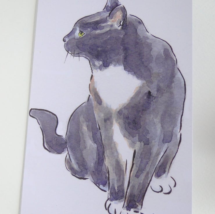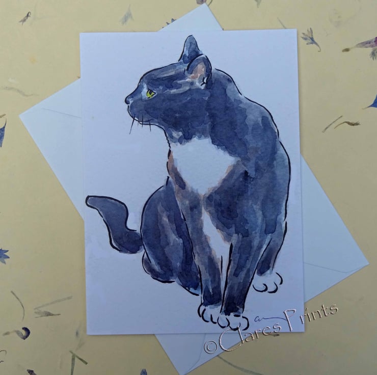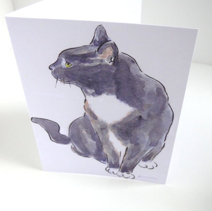 Blank greeting card from my original watercolour and ink painting "Black & White Cat"