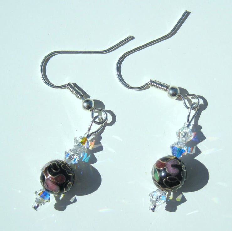 Black cloisonne earring accented with swarovski crystal faceted bicones giving a lovely sparkly effect.