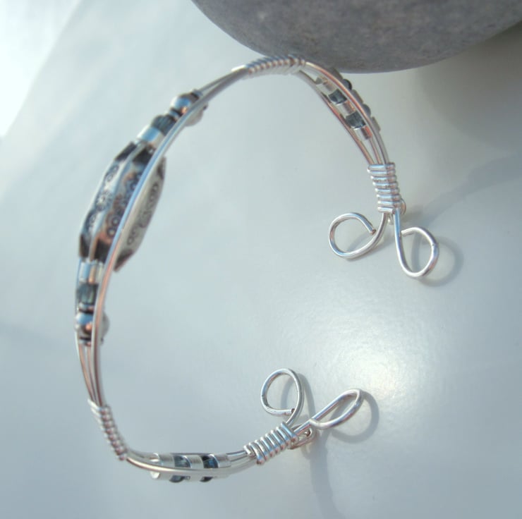 Tibetan silver bead wrapped bangle. All hand formed with silver plated copper wire and finished with hand formed twirls.