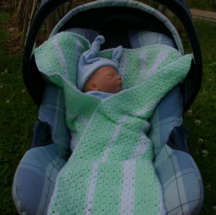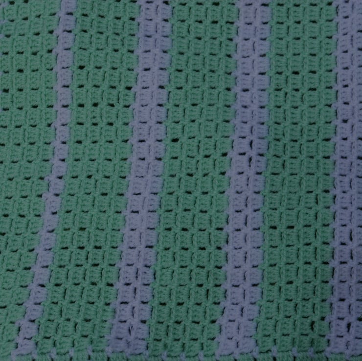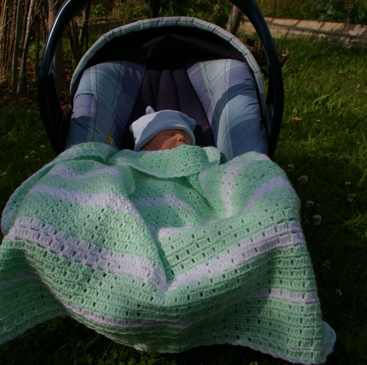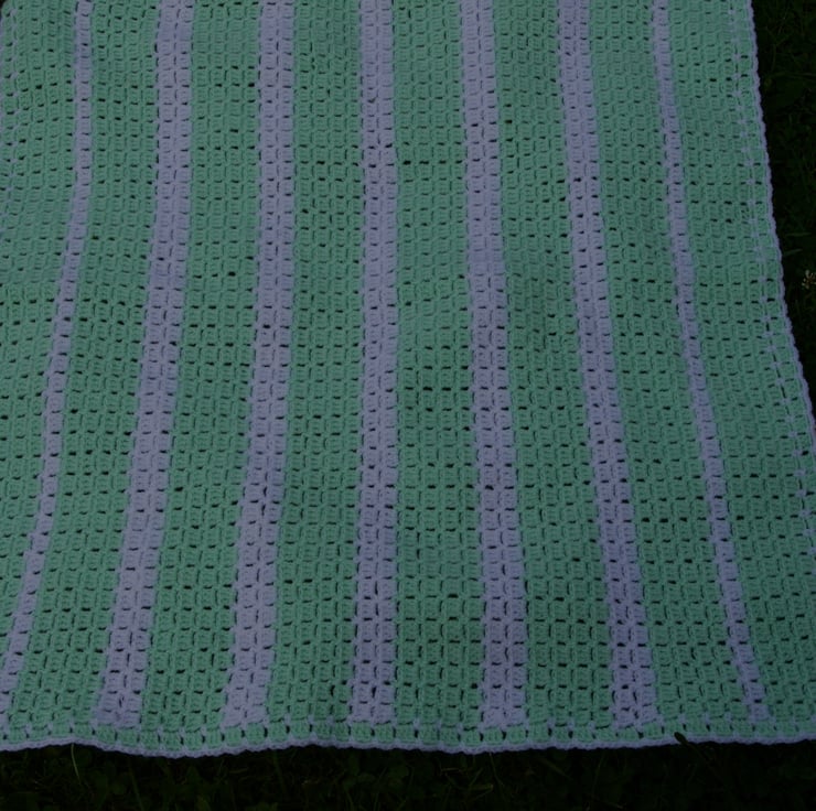 A pretty pattern baby blanket crocheted in a lovely Pale Green and white from100% soft Acrylic yarn. Just the right as a gift for a new baby.