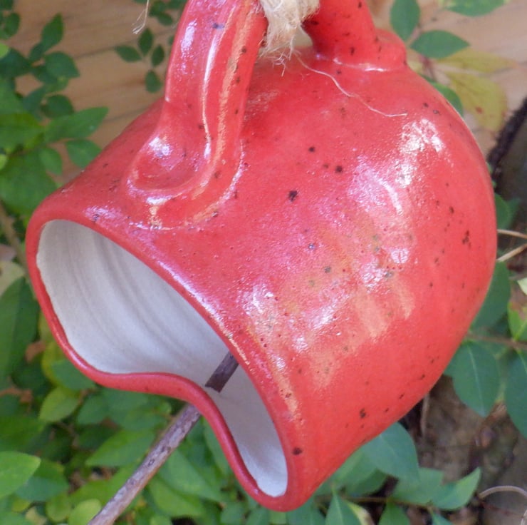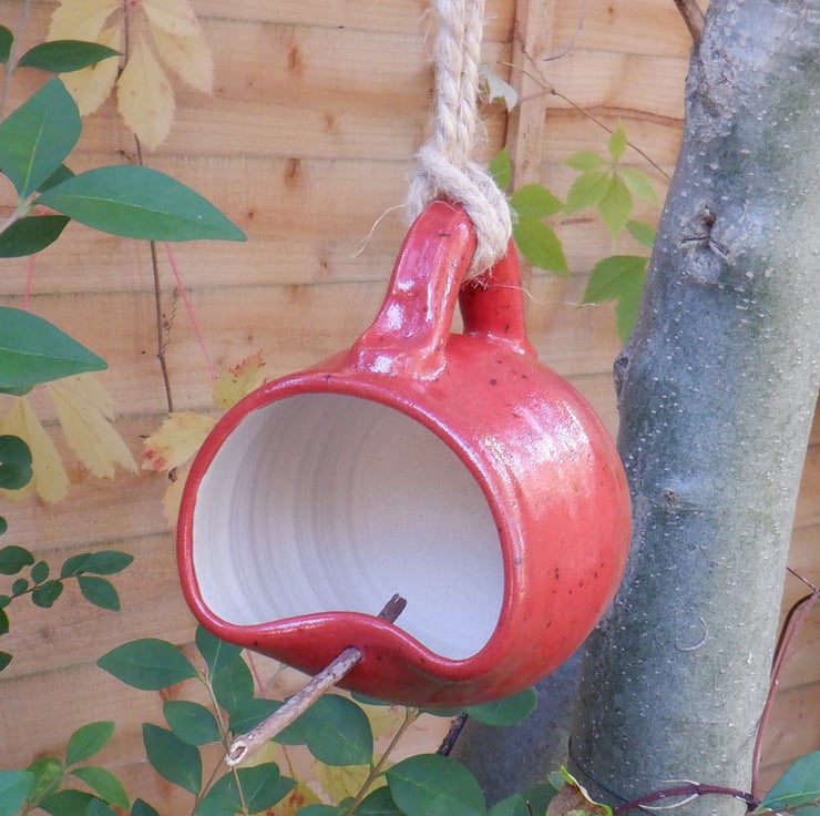 This feeder was thrown on my pottery wheel using strong off-white stoneware clay in the shape of a large coffee mug then turned on its side.
