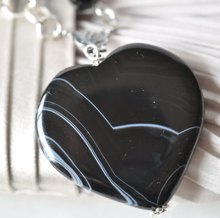The black agate heart has very subtle stripes over half of each side and the nuggets range from pure black to grey and brown colourings.