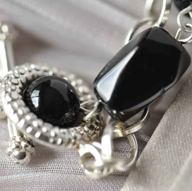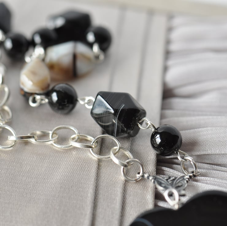 Beautiful handmade necklace featuring a stunning black agate heart pendant on a beaded strand of black agate rounds and faceted nugget beads and a chunky silver plated chain strand with a lovely Trinity Brass connector beads and finished with a toggle clasp.