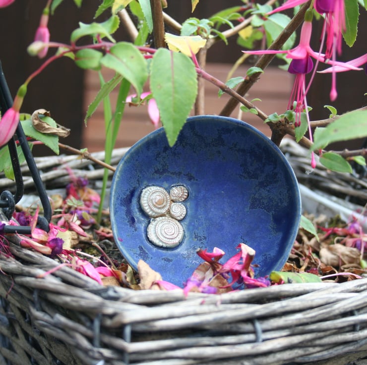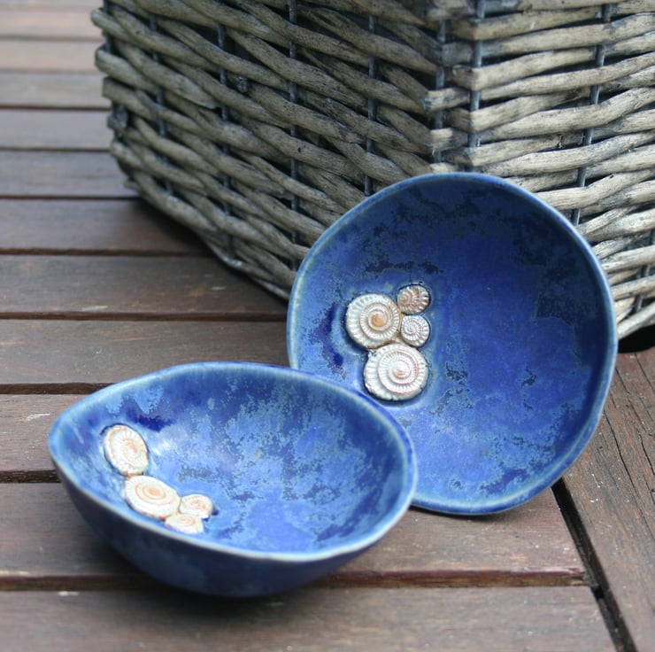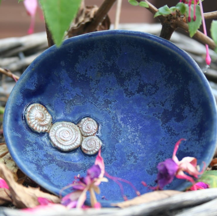 Handmade stoneware ceramic small dish with clay ammonite impressions on part of inside of dish, glazed with a blue matt glaze that has a mottled effect, ammonite detail finished in a slight green/silver look.