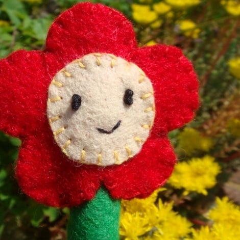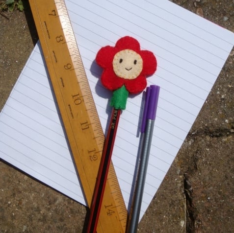 This beautifully hand-sewn pencil topper is a cute flower with a cheeky smile. It is made from thick, colourful felt and fits on the end of normal sized pencils and biros.