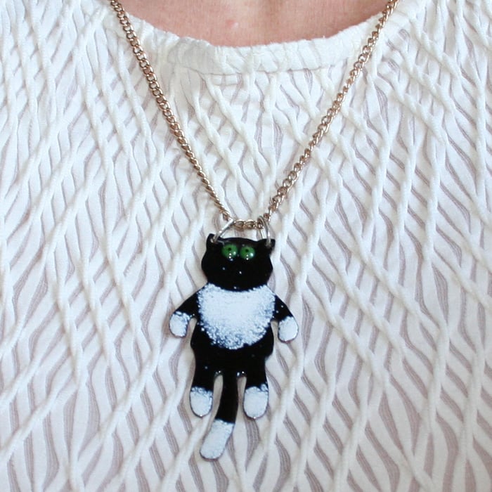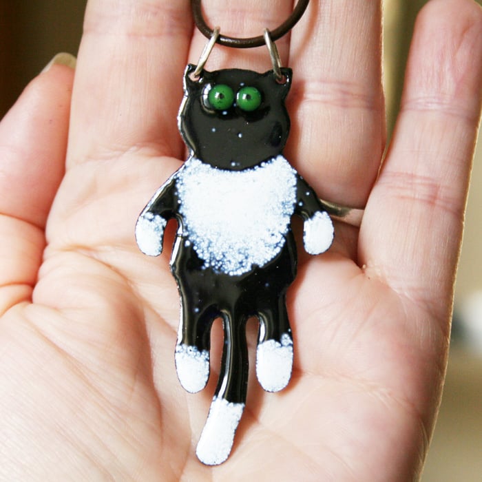 Small black and white cat pendant or tuxedo cat enamelled pendant.