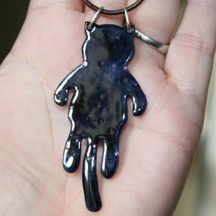 Hand enamelled on copper with silver jump rings through his ears which have been soldered shut.