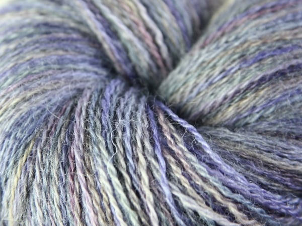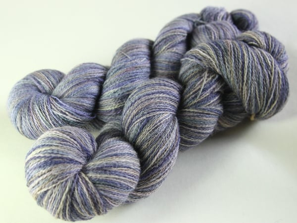 Shades of grey, lavender and purple. This lustrous, lofty and slightly fuzzy yarn should make beautiful lace projects. There is one skein left. It is a slight second as it has some short sections of yarn that have been badly spun. Therefore it is being offered at a slightly reduced price.
