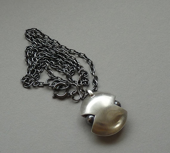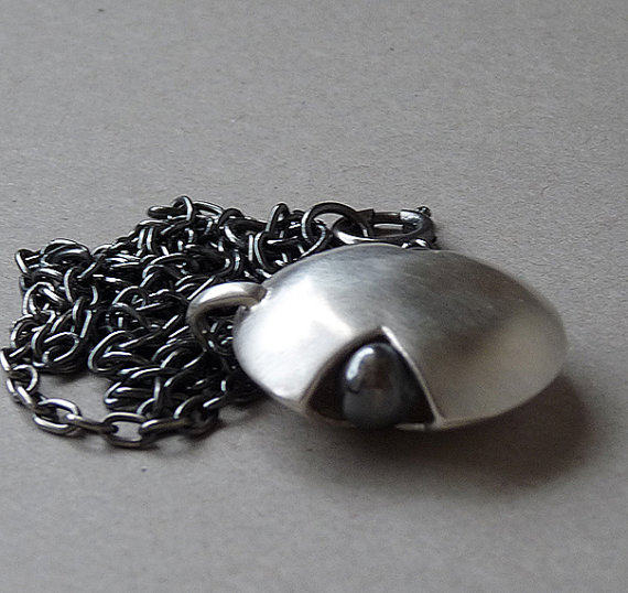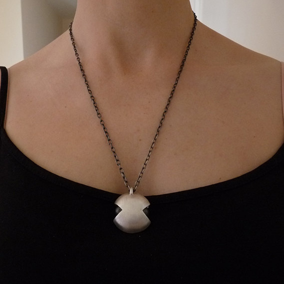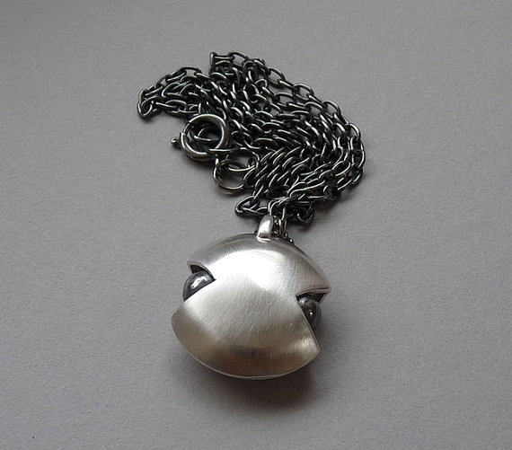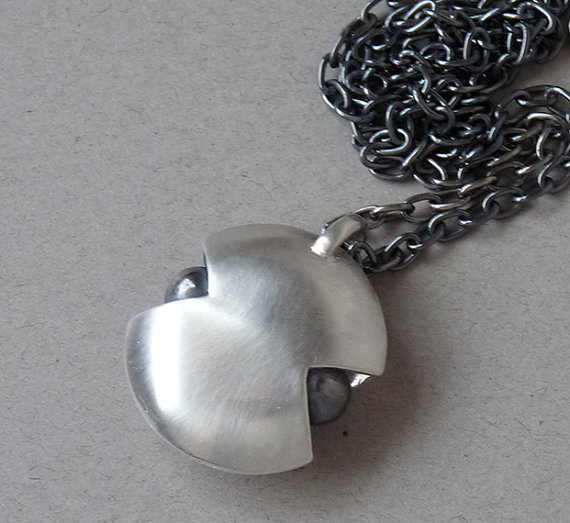 This modern and unique hollow pendant is completely hand fabricated in sterling silver. Two domes have been soldered together to create a hollow form. The pendant has been accented with two oxidized balls on each side. It has been polished to a satin finish . The balls have a mirror finish.