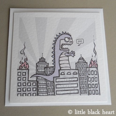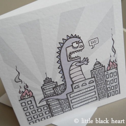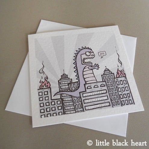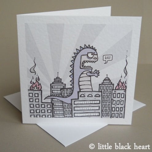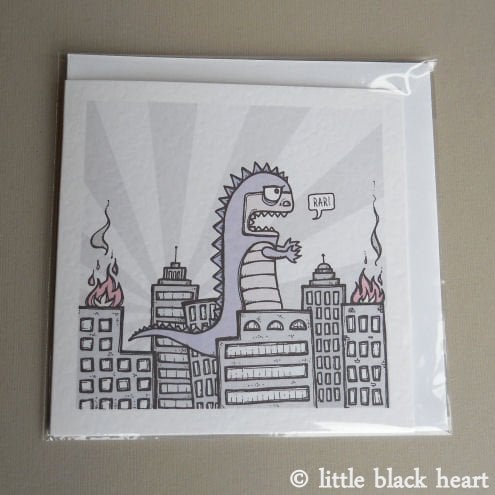 unique and quirky greetings card featuring godzilla, crashing through the city. poor little guy, he doesn't mean to be quite so destructive, i'm sure!