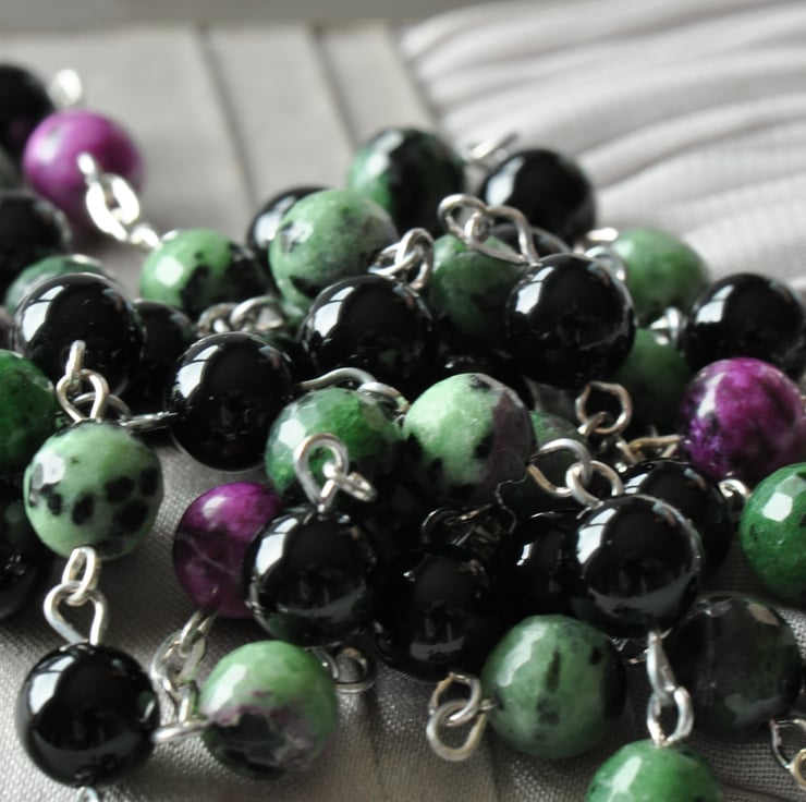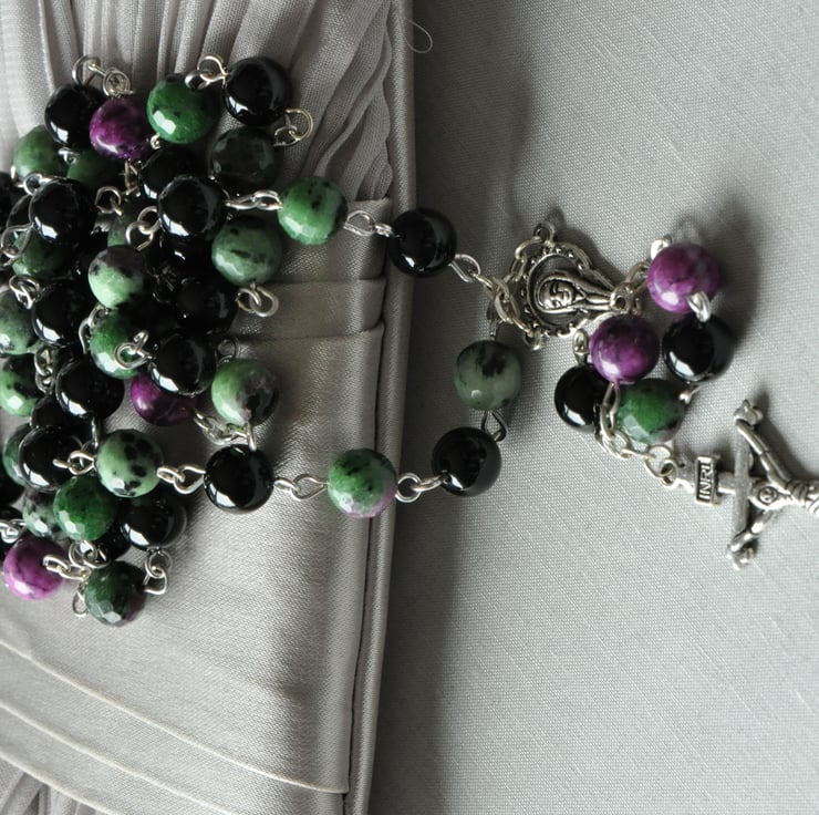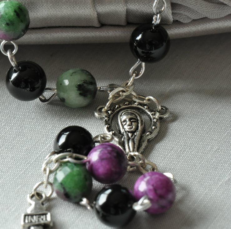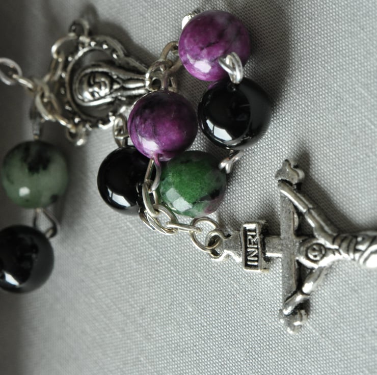 Handmade rosary beads featuring stunning Ruby Zoisite delicately faceted 8mm beads, Black Agate 8mm beads and Sugilite 8mm beads for the Pater (Our Father) beads.