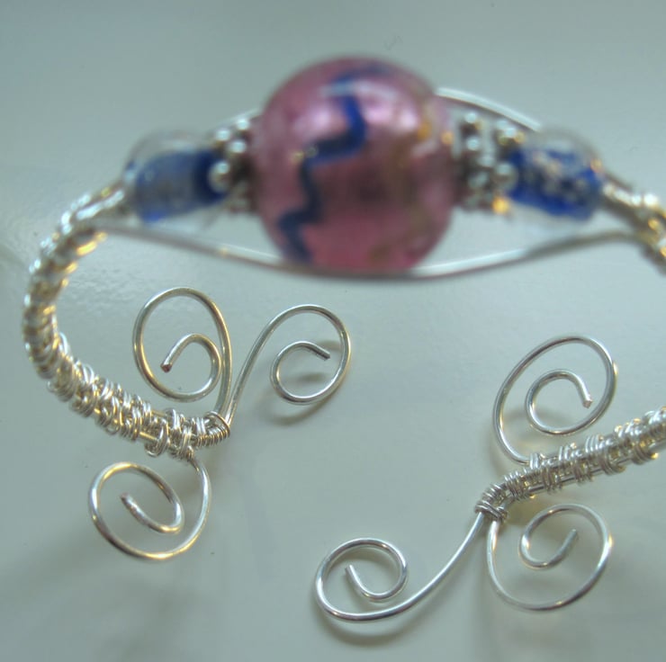 These beads are then embraced in hand wrapped Silver plated wire with formed ends.