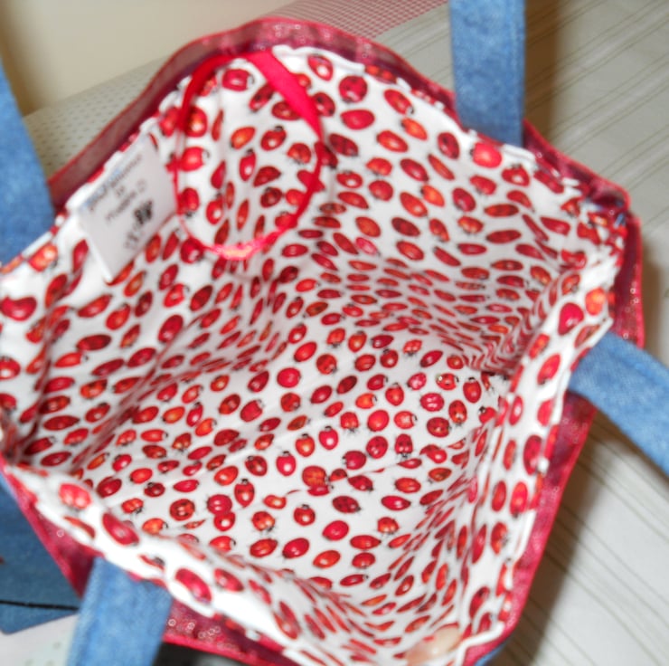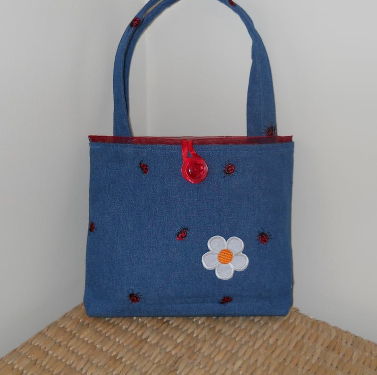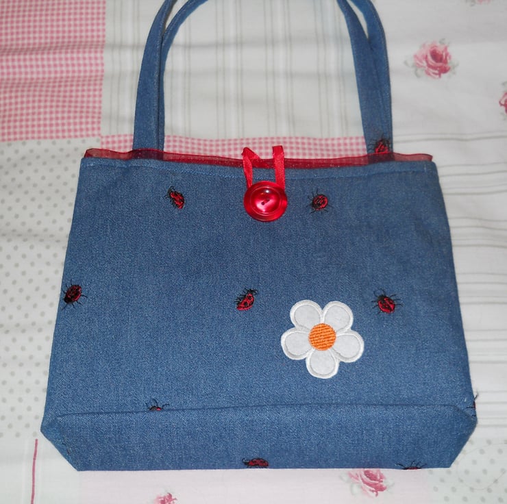 Girls cute bag with ladybirds embroidered on denim fabric . It is trimmed at the top with lovley red ribbon. The bag has a flower applicque and a button fastening to the front. The lining is a contrasting ladybird patterned cotton. A fabulous gift which is sure to bring a smile to any little girl's face.