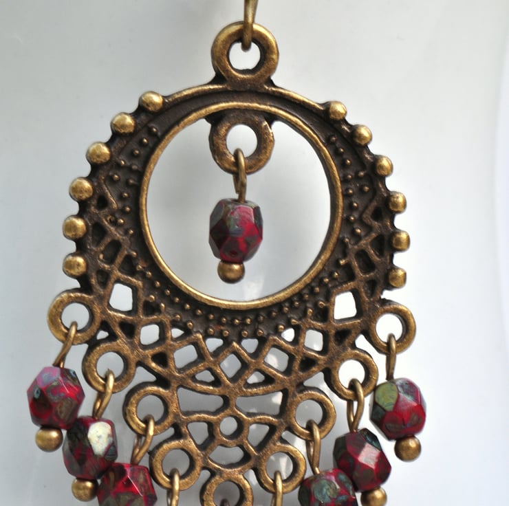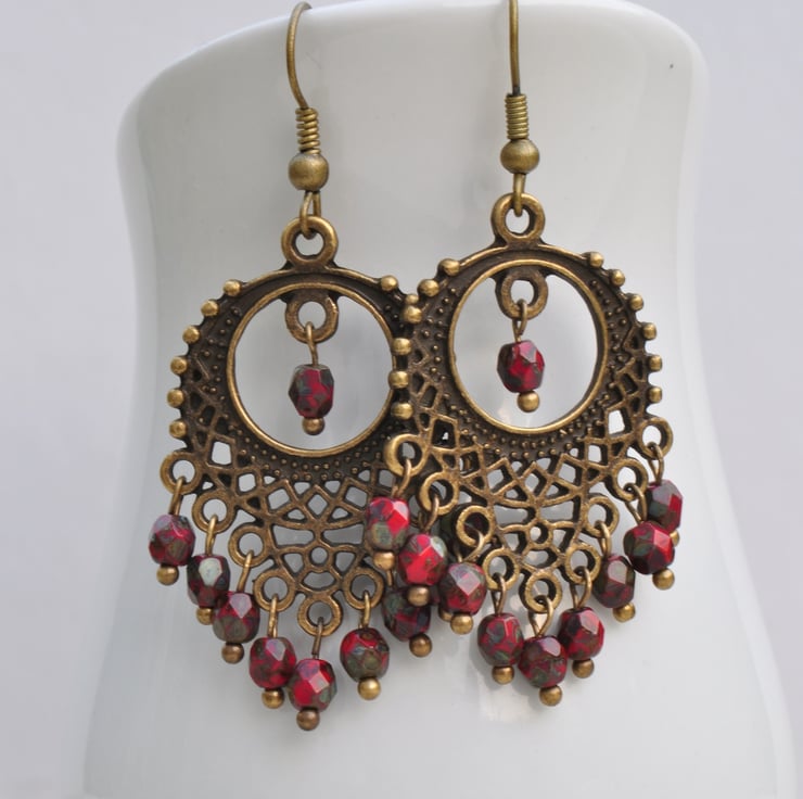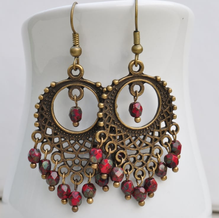 Stunning earrings made using antique bronze filigree chandelier findings with oodles of red Czech Picasso finish faceted beads on antique gold plated earwires.