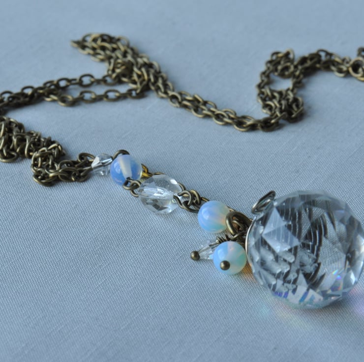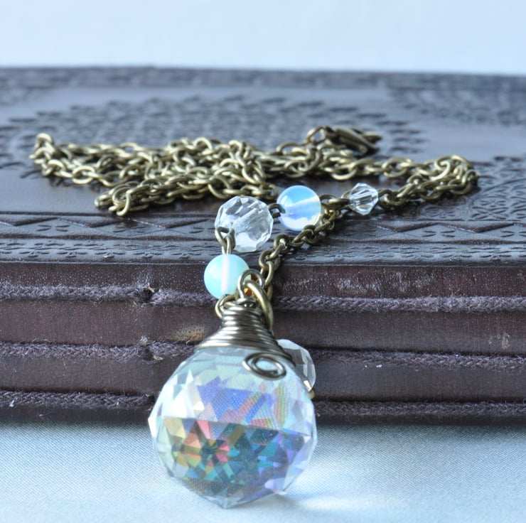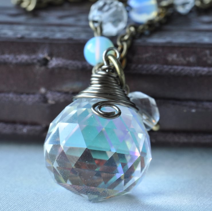 A Stunning pendant comprising of a sparkly crystal ball briolette which has an AB finish adding extra sparkle, hand woven with bronze coloured wire with a little bouquet drop of Czech firepolished crystal, Opalite and crystal Swarovski beads with a part beaded chain of similar beads and finished with antique gold plated chain with trigger clasp.