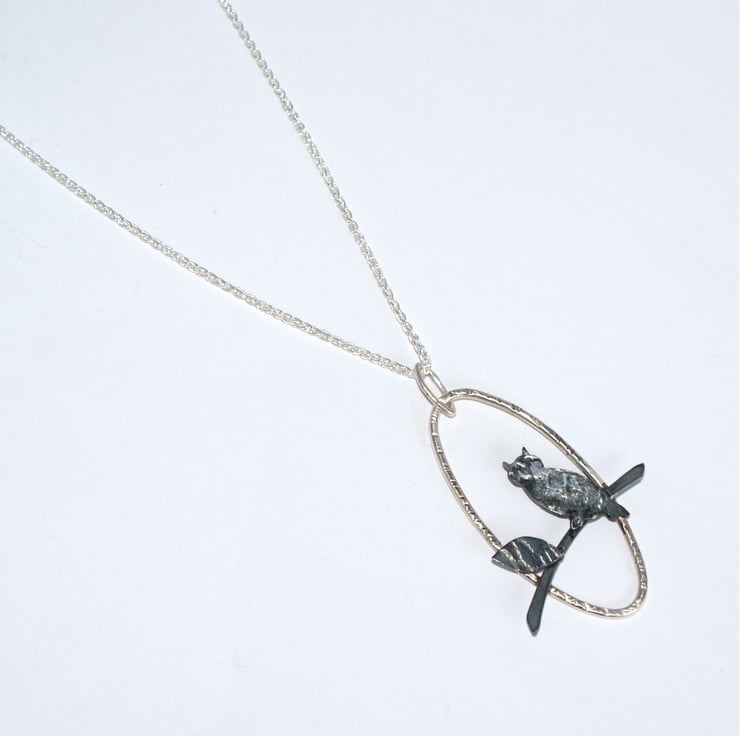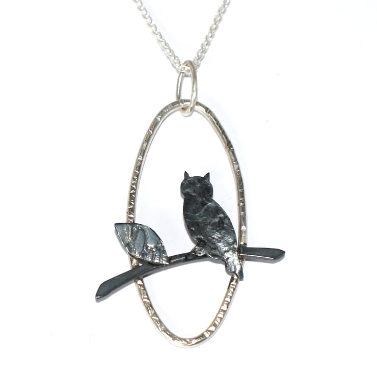 Gorgeous but simple oval shaped pendant made from textured sterling silver wire. The branch silhouette has been forged at the ends and has an oxidised copper owl and oxidised silver leaf. The pendant is hung from a 16 inch sterling silver spiga chain. Please note your necklace may vary very slightly from the image.