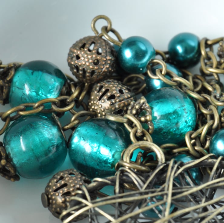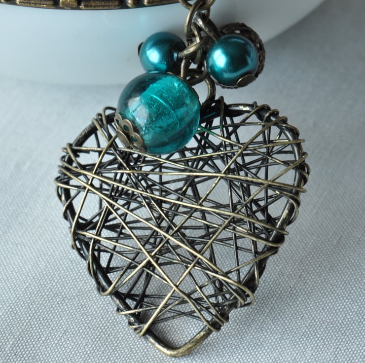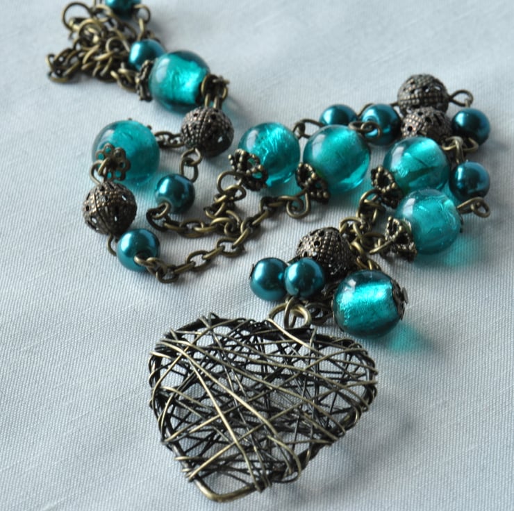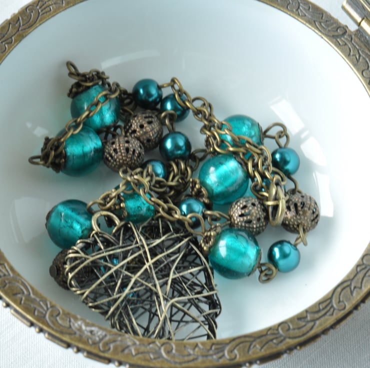 Lovely antique gold filigree heart pendant with a drop bouquet mix of teal foil glass, glass pearl and antique gold filigree beads on antique gold plated chain finished with toggle clasp.