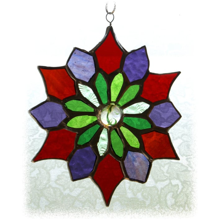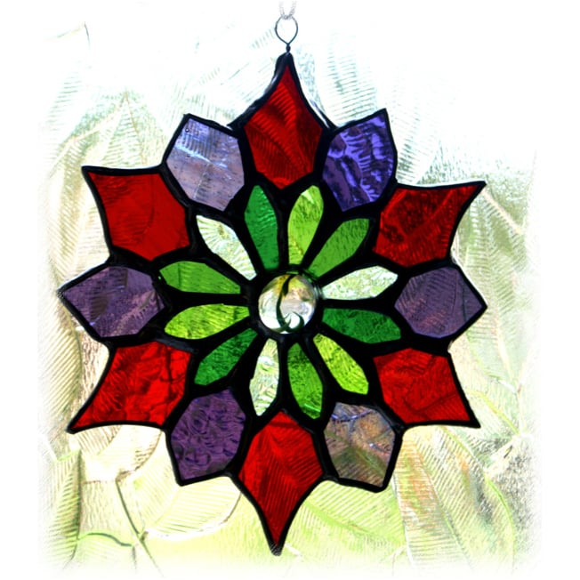 It comprises a flower with 12 outer glass petals in 3 vibrant shades and textures of red and 3 of purple and 12 smaller inner petals in 4 different shades of green. The centre is a clear glass nugget with a green swirl for added effect.