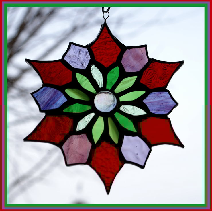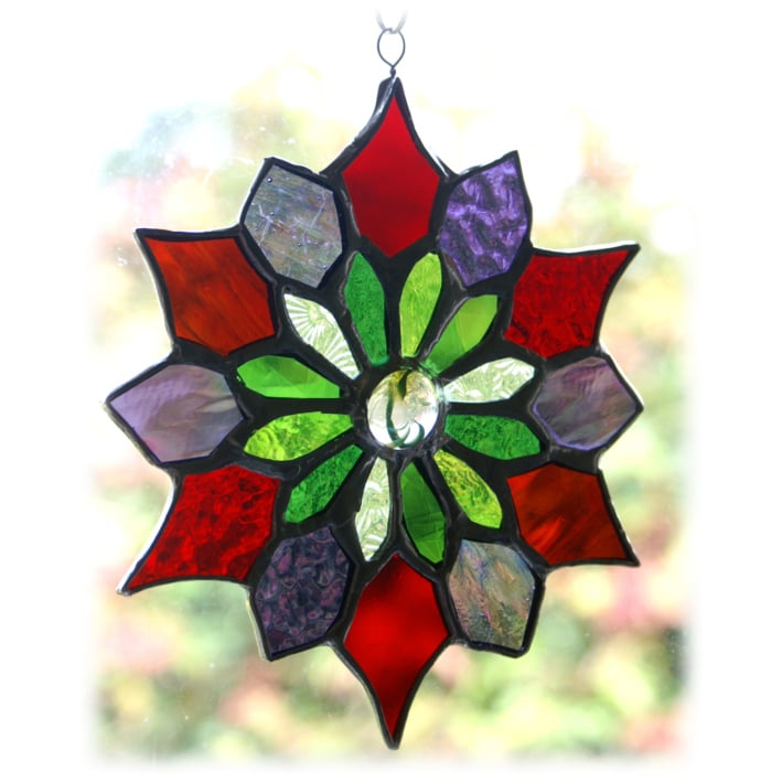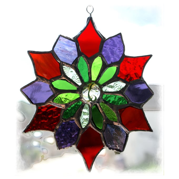 This is a unique stained glass suncatcher made using the Tiffany copper foil technique.