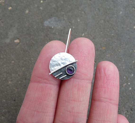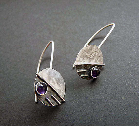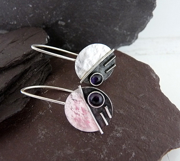 These contemporary earrings with Amethyst are entirely hand made in sterling silver. They have been textured, partially oxidized and polished to a bright and shiny finish. They have handcrafted, sterling silver ear hooks soldered to them.