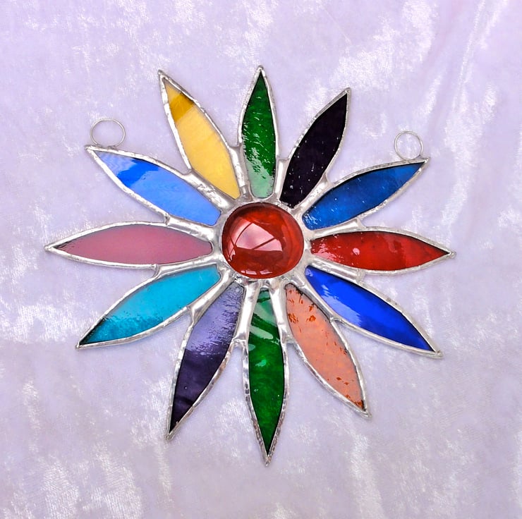 The daisy has been made from a mixture of colours and textured glass, each piece of glass has been copper foiled and soldered together with a large orange glass nugget in the middle. Two rings and a length of fishing line has been attached for hanging purposes.