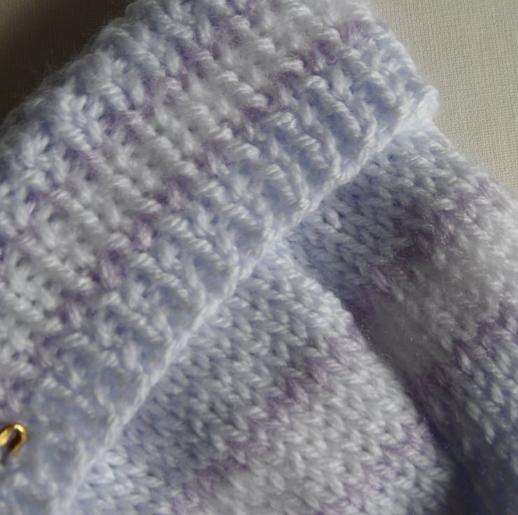 The set fits from birth to 3 months, is knitted in stocking stitch with a ribbed edge and has two white stripes bordered in a darker lilac .