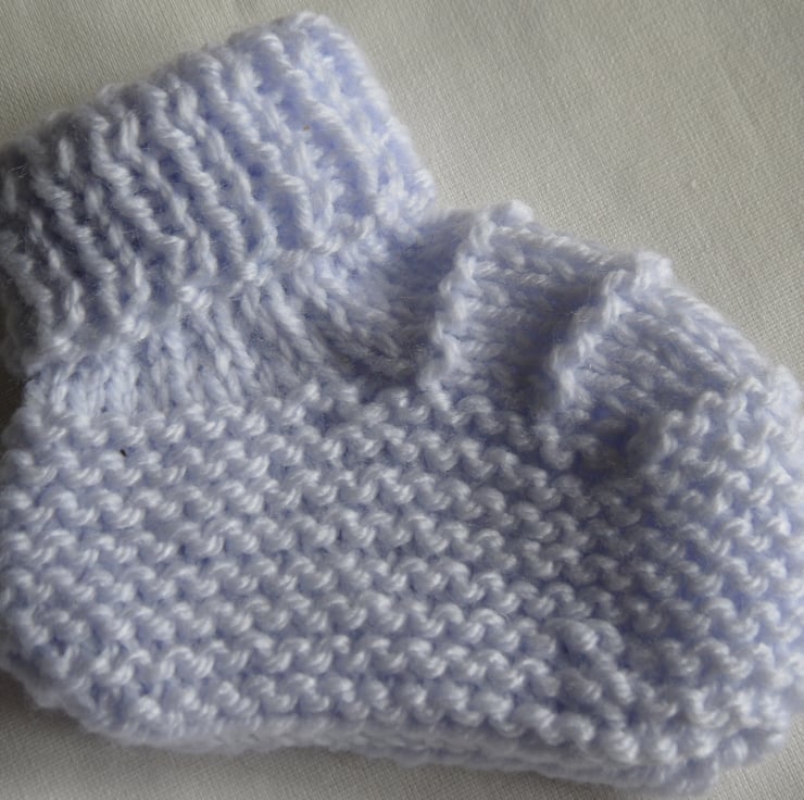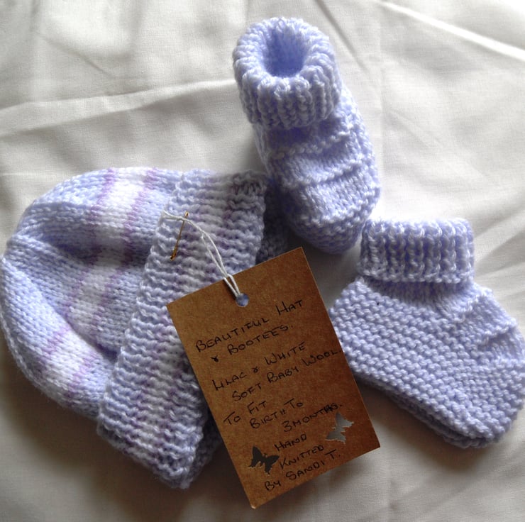 A beautiful hat and bootees set in lilac and white soft baby wool.
