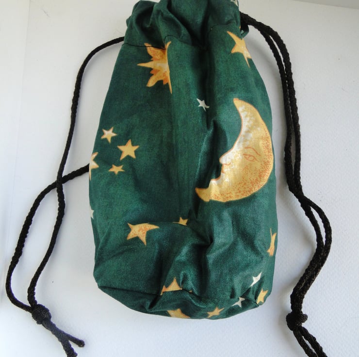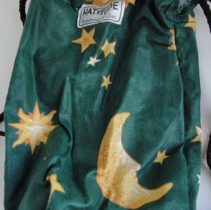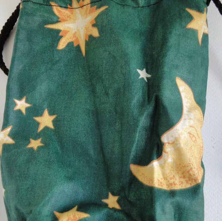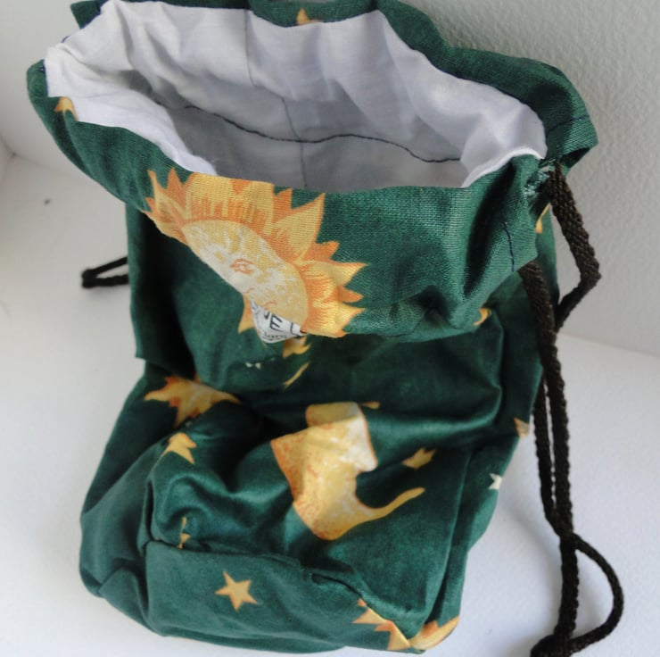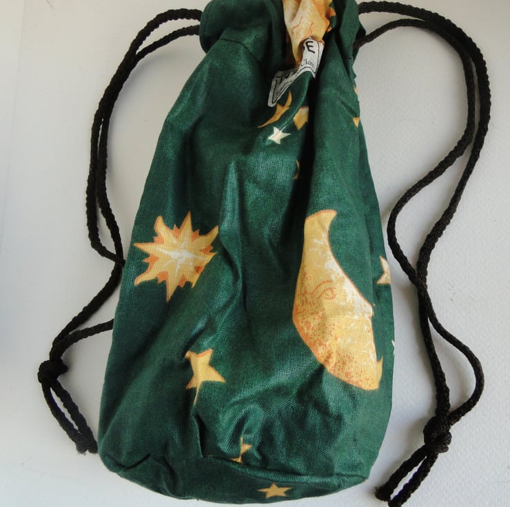 Made from green fabric with yellow stars, moons, and suns pattern fully lined with white fabric. Brown cord drawstring.