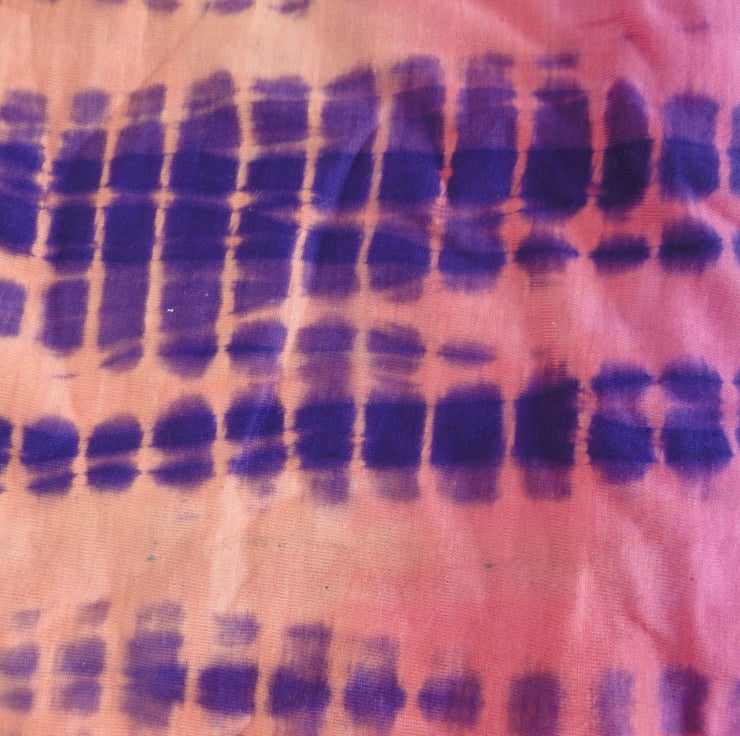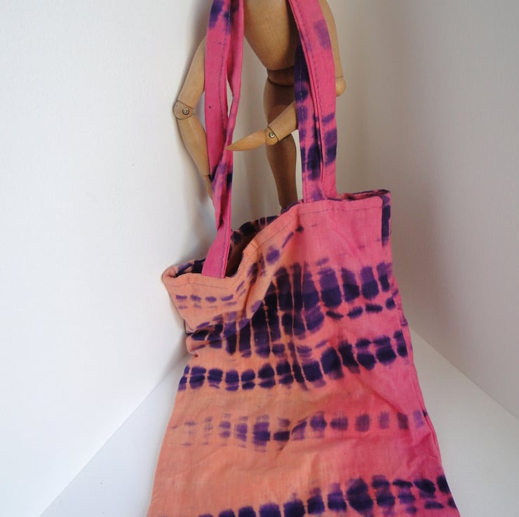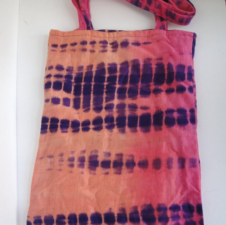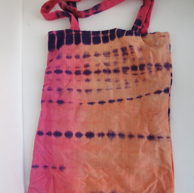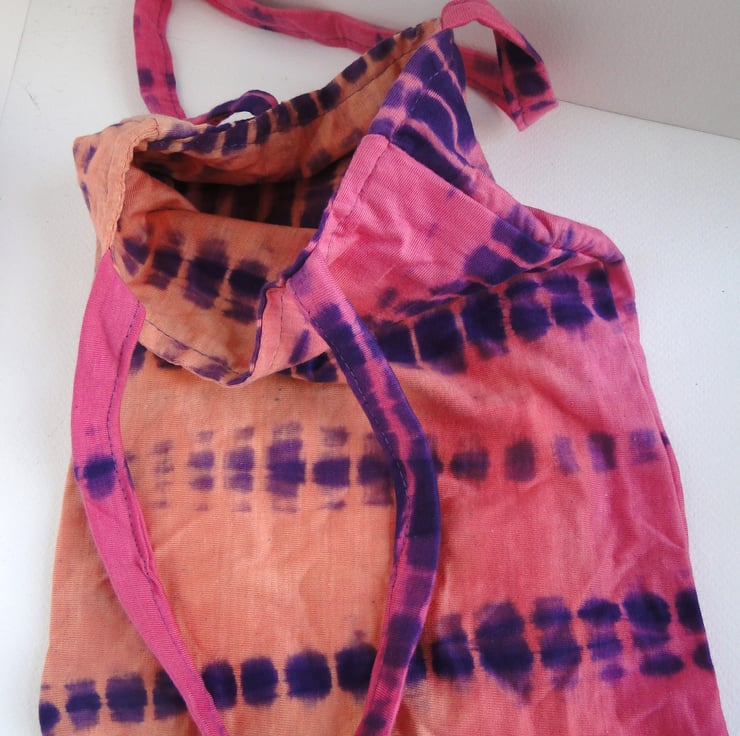 Made from jersey fabric with orange, pink and purple pattern. Has small handles.