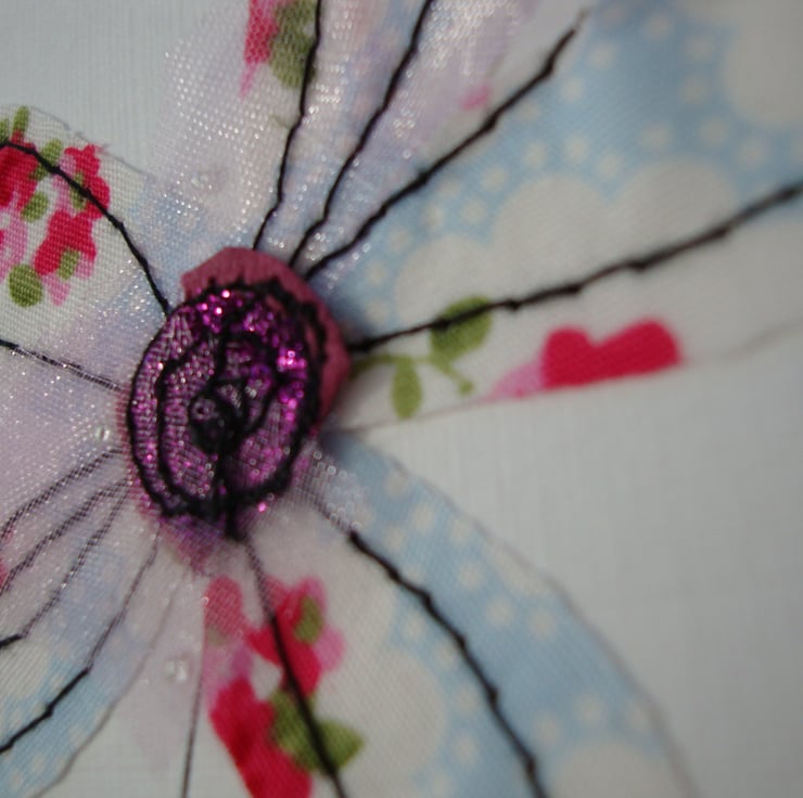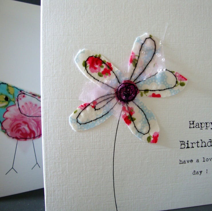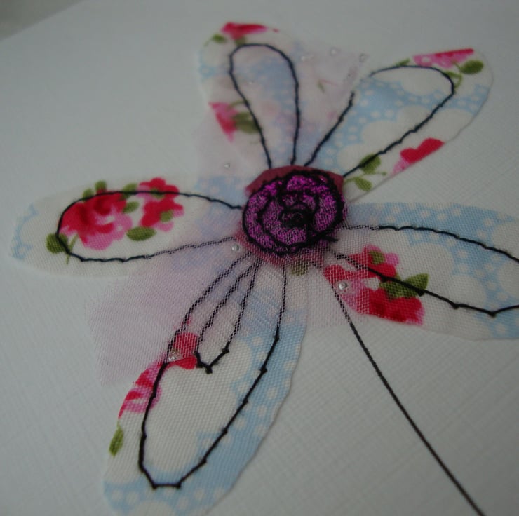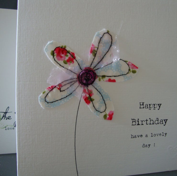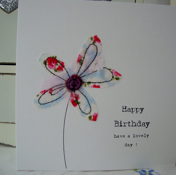 this is a pretty card for that special birthday, it has been made from fabric with a floral print free machined onto card.
