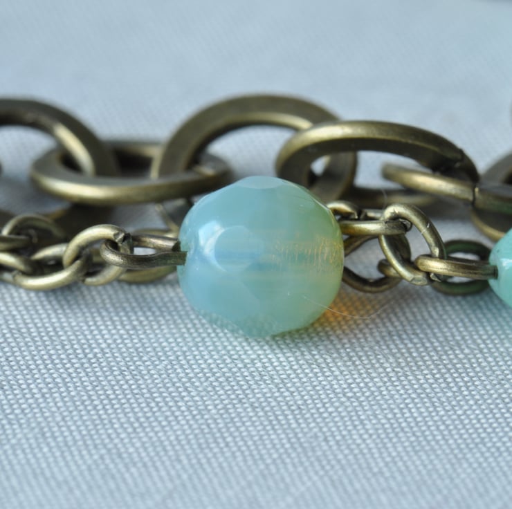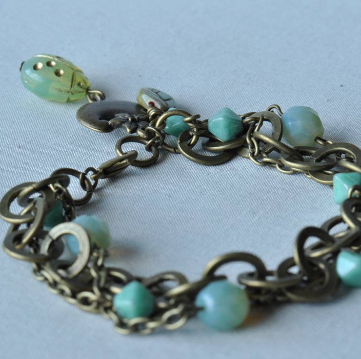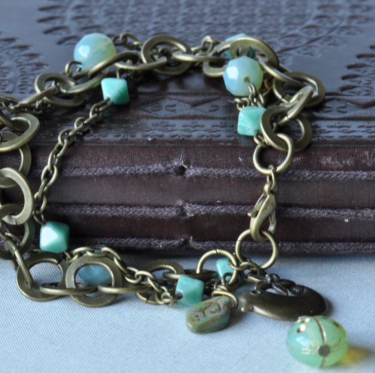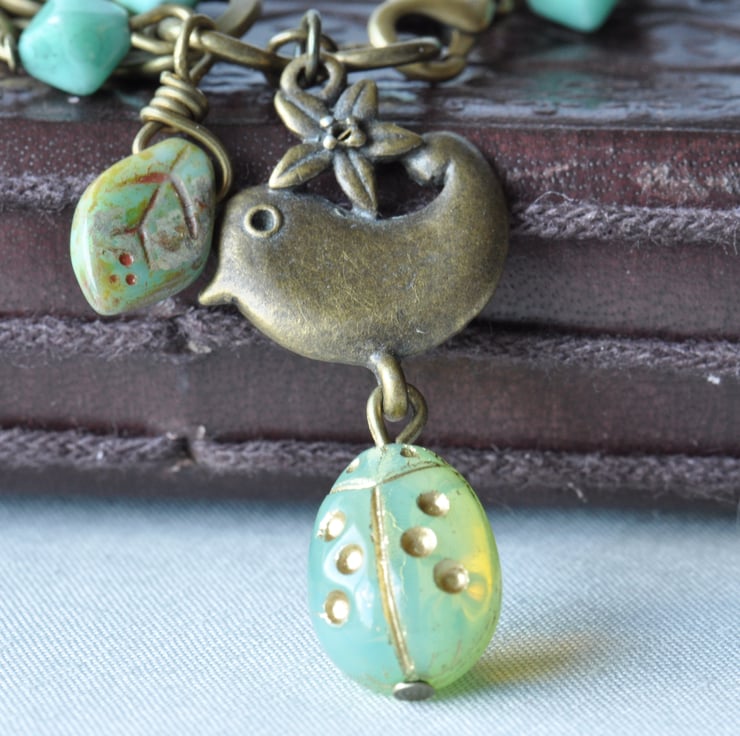 Chunky antique gold plated chain and two strands of chain and Czech aqua opal firepolished and dark aqua bicone beads finished with trigger clasp and drops of a lovely bird connector bead, Czech aqua ladybird bead, Czech Picasso finish leaf and bicone glass bead.