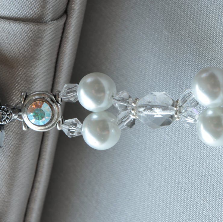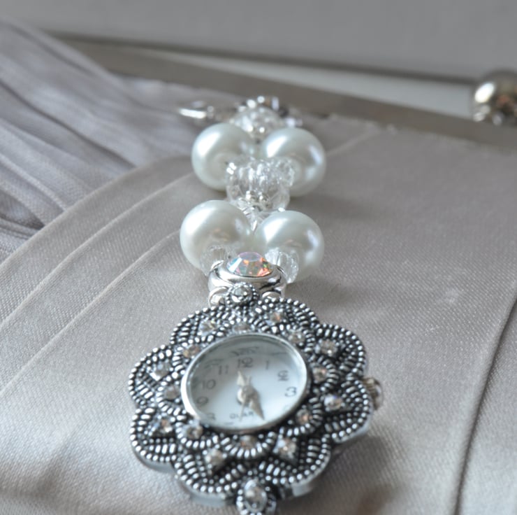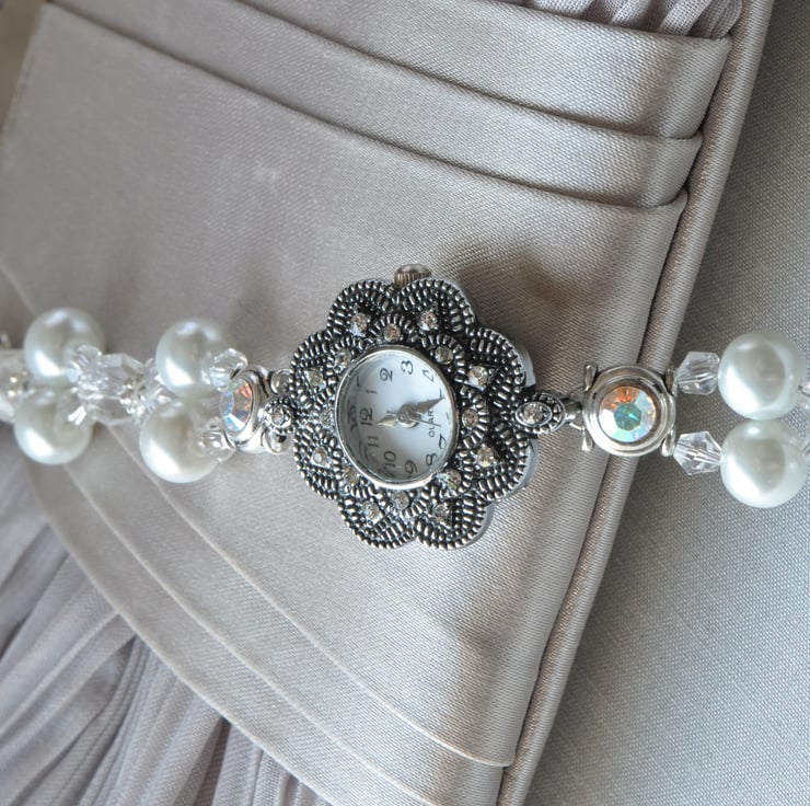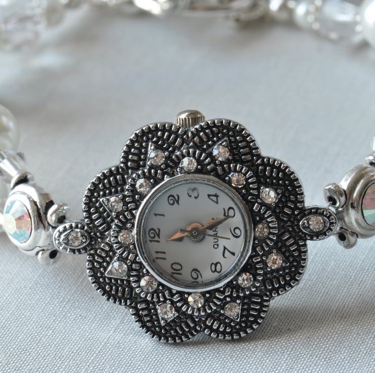 Stunning diamante encrusted watch face with a beaded strap of sparkly AB finish Swarovski crystal slider beads, Glass Pearls, crystal bicone beads and Firepolished 8mm faceted beads finished with a flower toggle clasp.