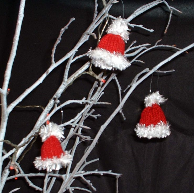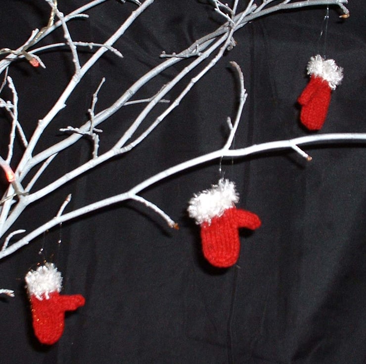3 Hand knitted wool mitten christmas decorations- set of 3 in red & white
