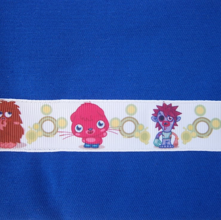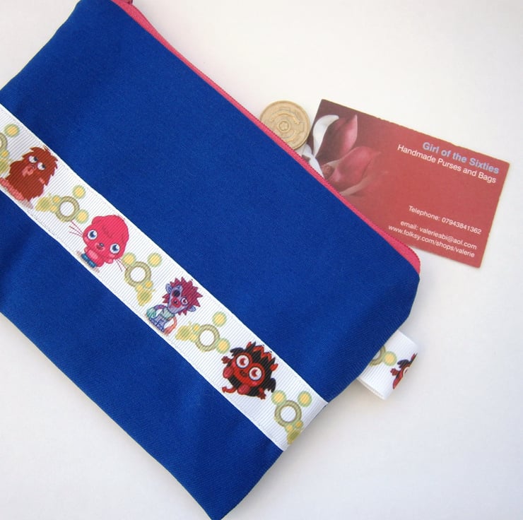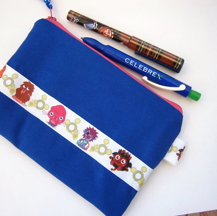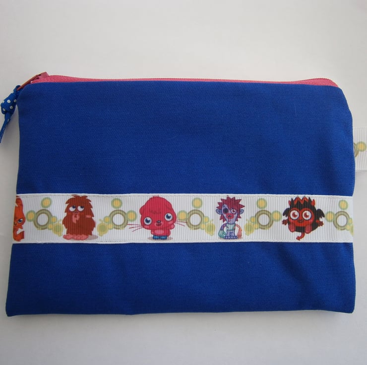 Cute Moshi Monsters pencil case with contrasting zipper and ribbon and lining