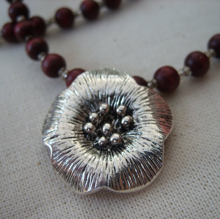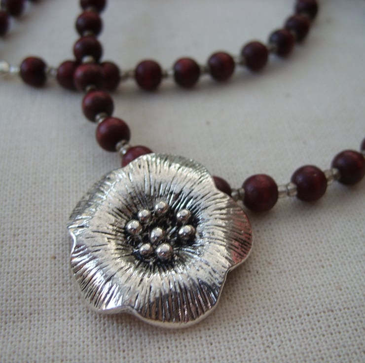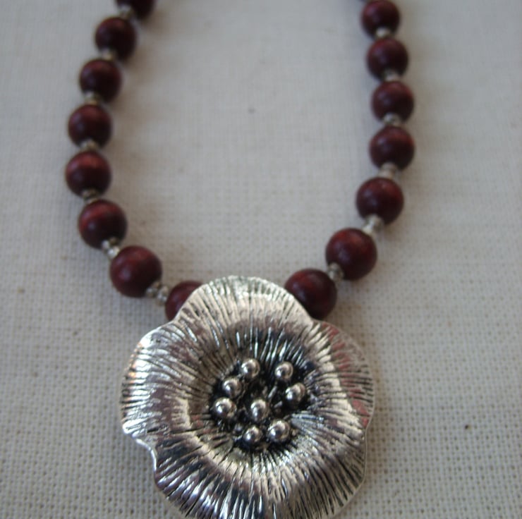 Small silver tone flower pendant on a 18 inch necklace of red tone wooden beads.
