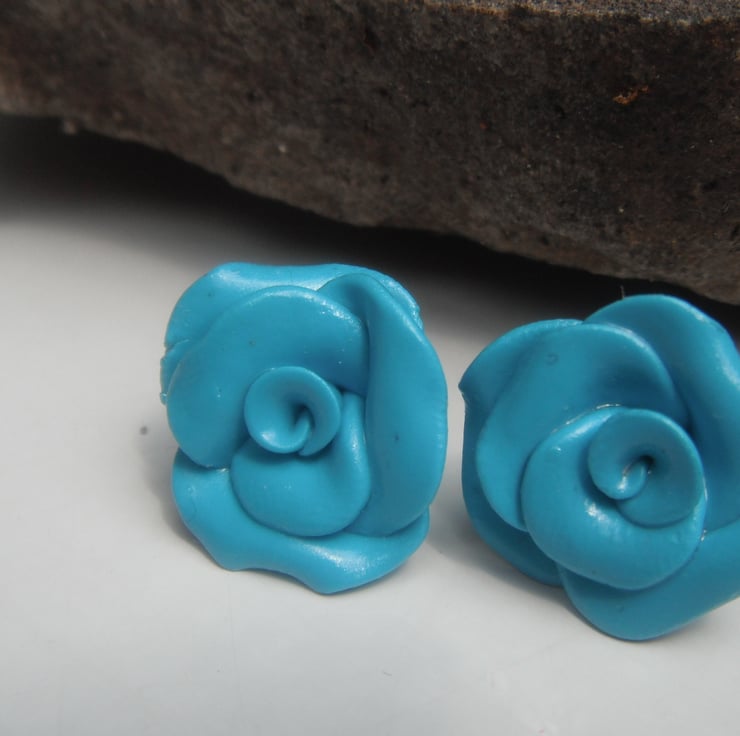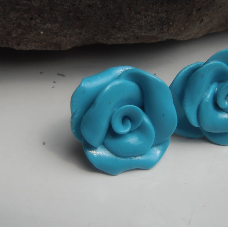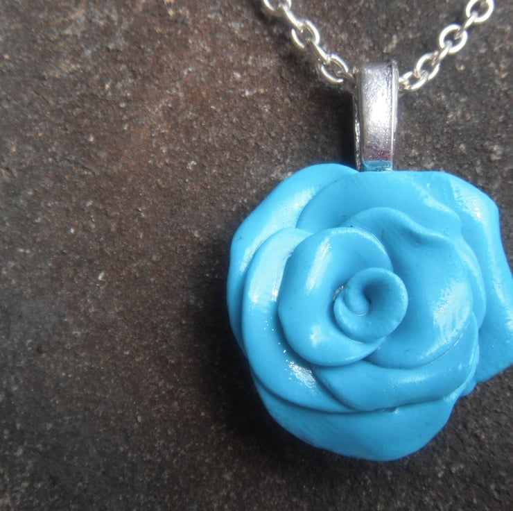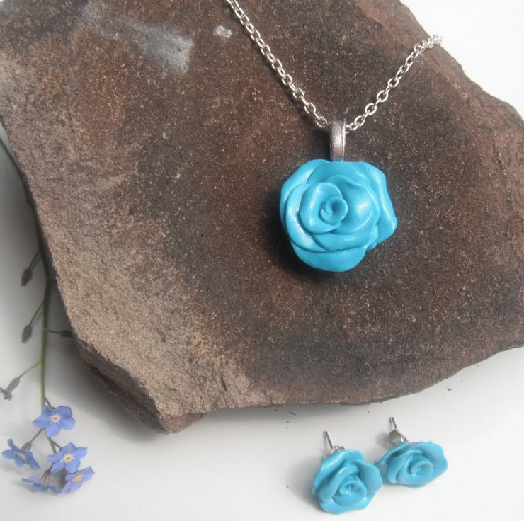 This is a silver plated necklace and earring set, with a hand crafted polymer clay rose pendant, and stud earrings, made from turquoise blue fimo. Matching items available.