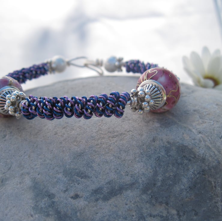 Violet twisted wire bangle with Silver plated Stardust beads and Tibetan beads completed with a Glass Rose accent bead.